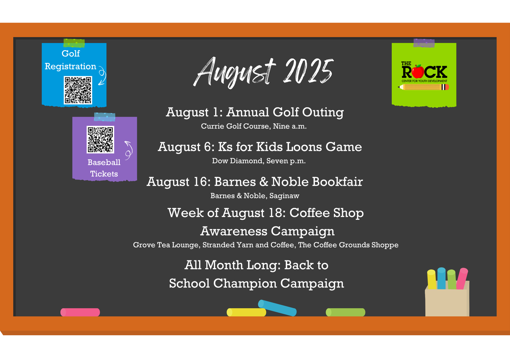 Support the youth in our programs at the Saginaw Barnes & Noble bookfair on August 16th. We’ll be featuring artwork made by the students in our programs, and a portion of sales will be donated back to The ROCK.